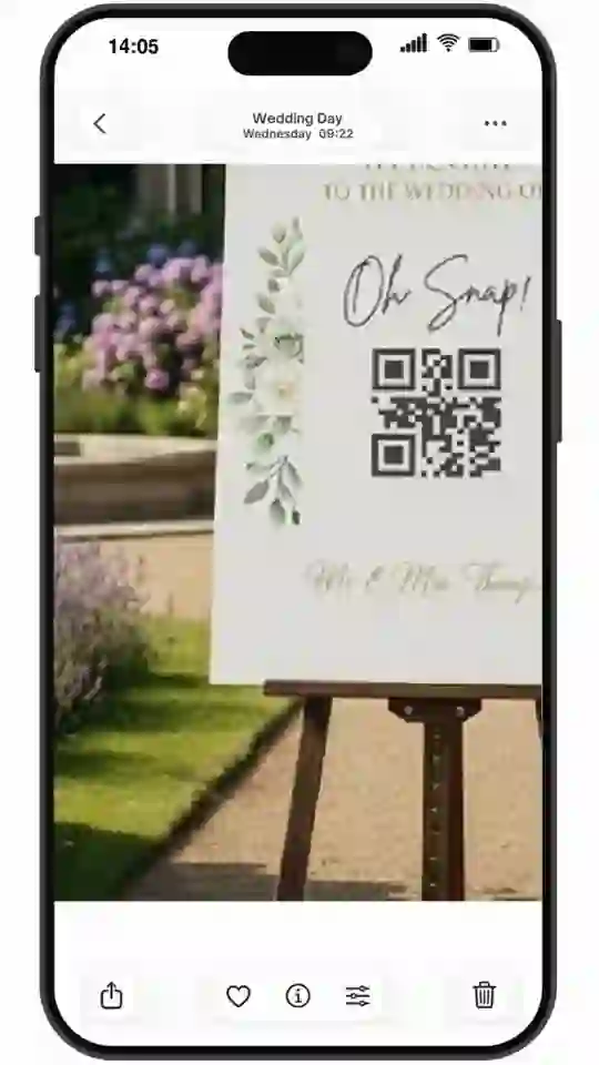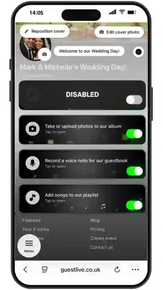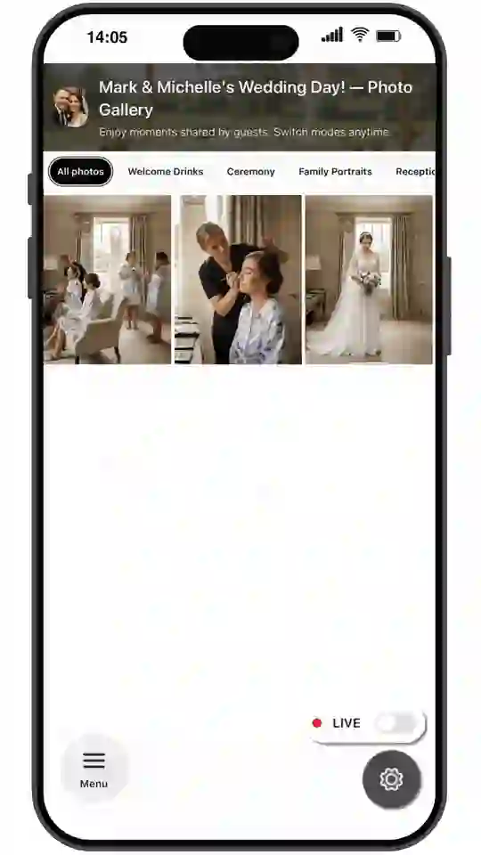Instant photo uploads and live gallery updates. Guests contribute, you curate.